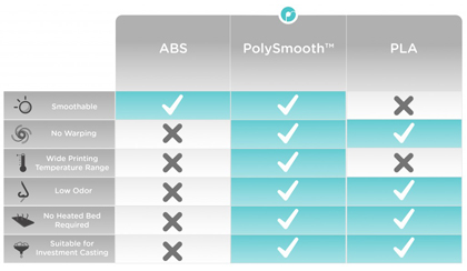 Balanced Mechanical Properties - PolySmooth™ features well balanced mechanical properties, outperforming ABS and PLA on most attributes , making it an ideal material for everyday 3D printing.